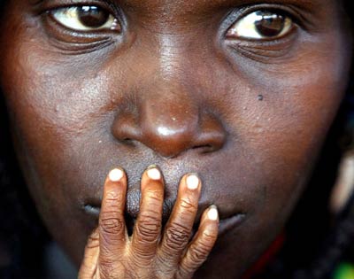 图为今年8月,尼日尔西北部的一个紧急救助医疗站,营养不良的阿拉萨.加力索用自己的手指压着妈妈的嘴唇。(路透社/费因巴尔.奥莱利)