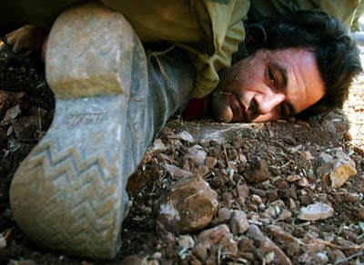 图为2005年1月伊拉克大选期间,一名士兵为了表示自己的敬意,正爬向投票站行使自己的权利。(路透社/基莫-阿卡尔)