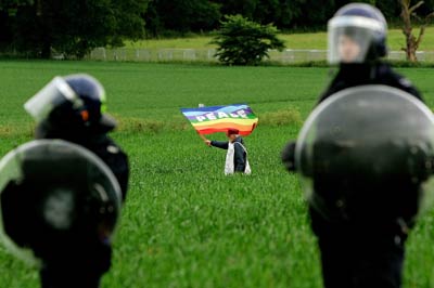 图为今年7月,八国集团峰会在苏格兰“鹰谷”召开期间,一名示威者在会场外抗议。(路透社/亚历山德鲁.比安奇)