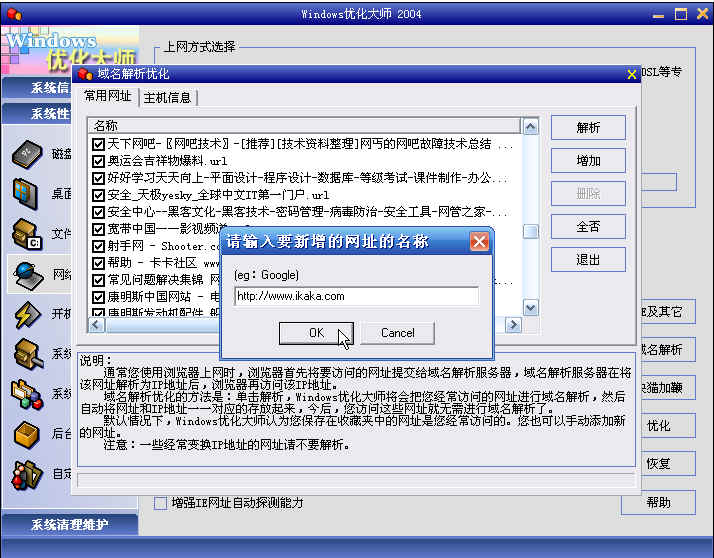还可以使用优化大师2006中的"域名解析"功能,将http://www.ikaka.com"添加.