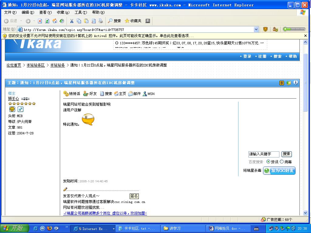 从昨天上午开始就感觉卡卡社区很卡,网页打开很慢,昨天晚上就根本上不了,而上金山社区,安全中国,新浪,搜狐等都很畅,原来还以为是自己机子有问题,看来不是.