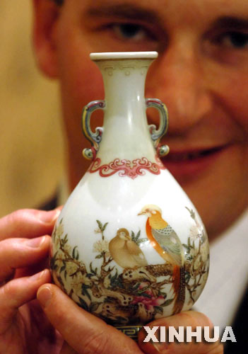 NO.1:清乾隆御制珐琅彩“古月轩”题诗花石锦鸡图双耳瓶(器高16.5厘米,香港苏富比2005秋拍,成交价:人民币122,408,800元)