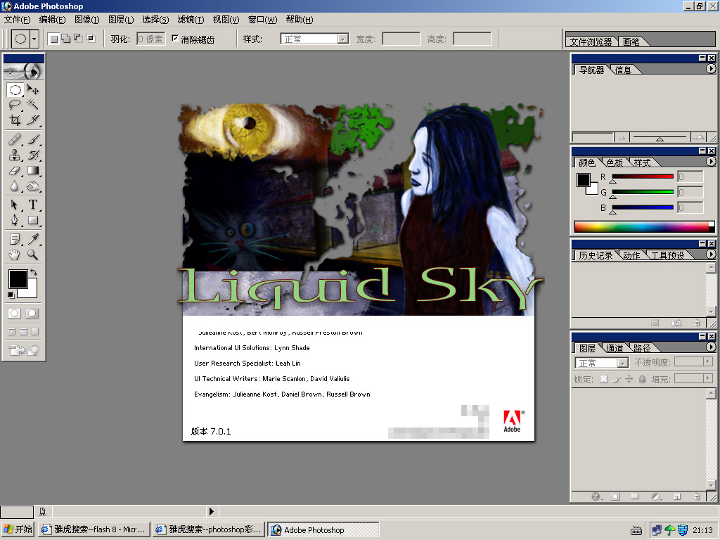 这是我7.0版的彩蛋,各版本是不一样的.无论你现在使用的是哪个版本,按住CTRL键,点一下"帮助"菜单下的"关于PHOTOSHOP",看看会出现什么~~ 注意其中的文字