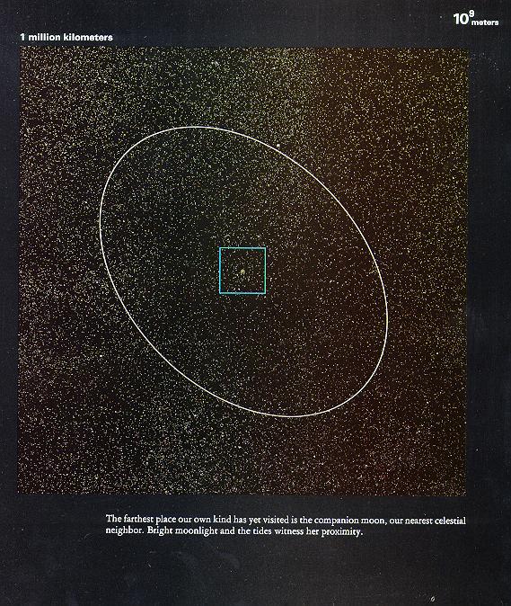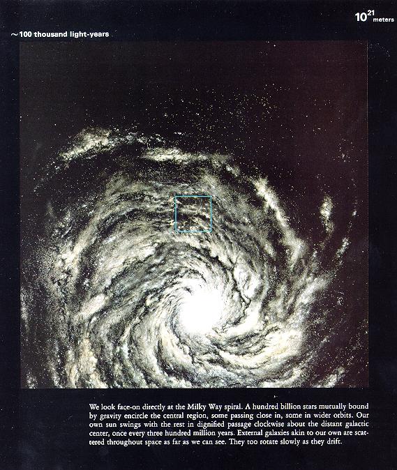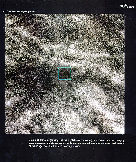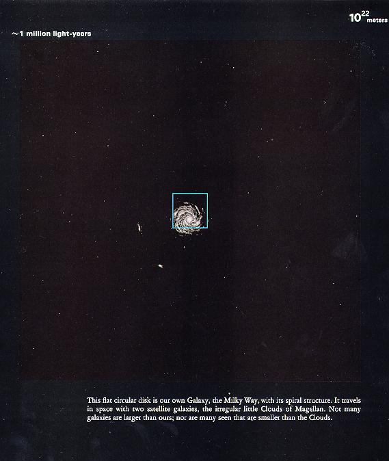 在10万光年这样的数量级下,我们就看见了整个的银河系。事实上,银河系的直径就是十万光年。真有哪位能发明个跟光速一边快的飞船,从银河系的这边飞到对面来个大吊角,就要十万年的时间!##,在这样漫长的旅程来看,人生不过朝生暮死,蜉蝣一般。但这只是对相对于银河系静止的观测者而言,船上的人员感受到的旅程其实只有数分钟。相对论呀,深了去了。