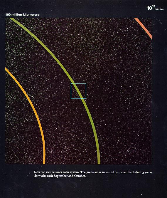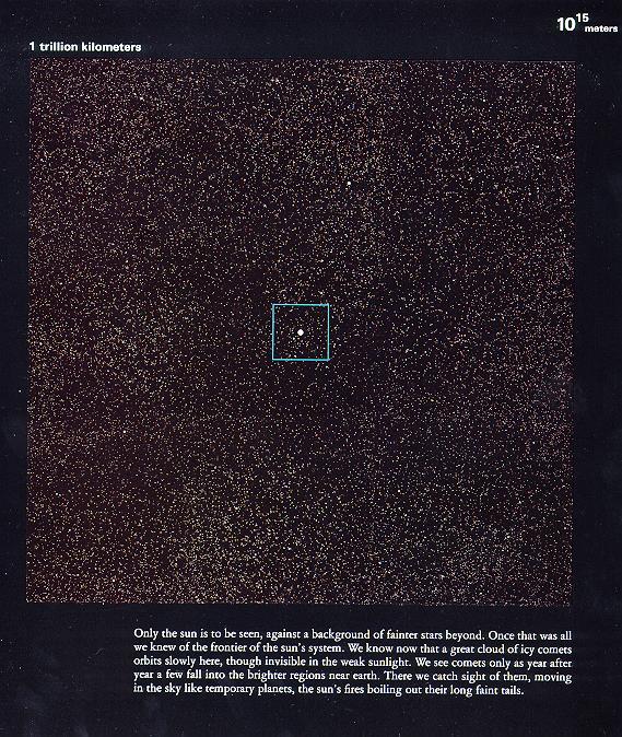 放大十倍来观察以繁星为背景的太阳系。说是繁星,其实与太阳最近的恒星——半人马座比邻星都是在4.22光年开外的。图中的亮点仅仅只是背景上离得八丈远的星星呢,并不是太阳系的一部分。