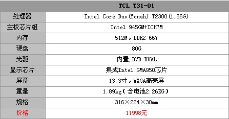 TCL的T31机身采用了全白设计,材质为ABS,它也特别在外壳上阴刻了线条,大大增加了美观度。T31的设计并没有太过紧凑,整体布局大方得体。T31号称“丽屏靓影”,它采用13.3英寸高亮镜面宽屏显示,内置DVD刻录光驱,可以让喜欢电影的女性朋友在享受闲暇的时候可以得到更好的视觉享受,而且其重量仅仅1.89公斤,十分方便携带,可以说无论从设计还是重量上这款笔记本都是定位于女性消费者。而作为一款Napa笔记本,T31除了外表靓丽外,内涵也十分丰富,双核心酷睿处理器强劲的性能让它可以轻松应对日常工作应用。附件: