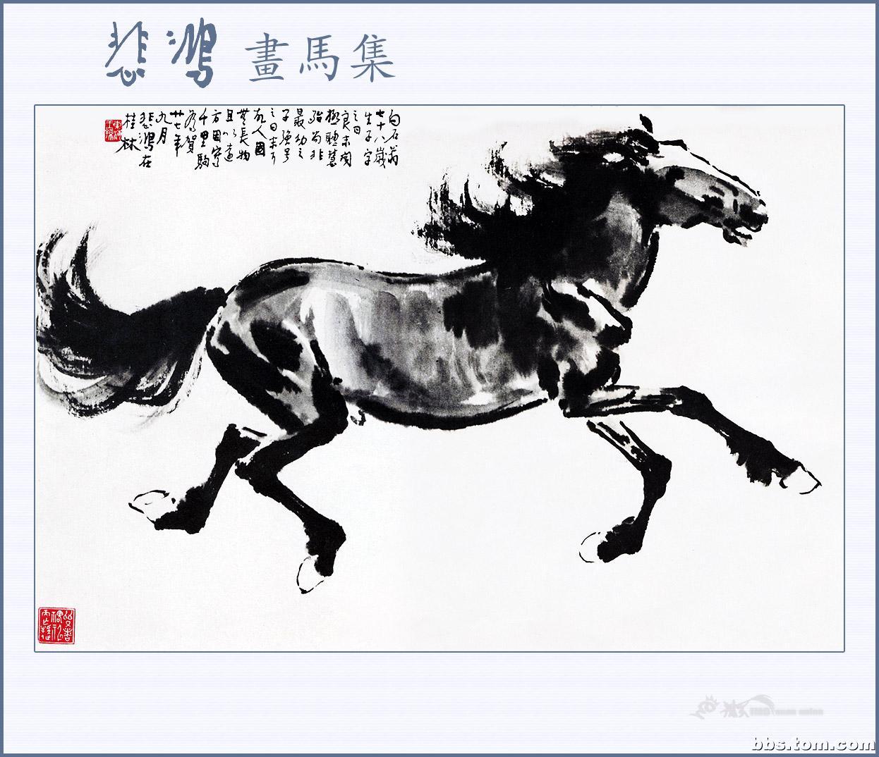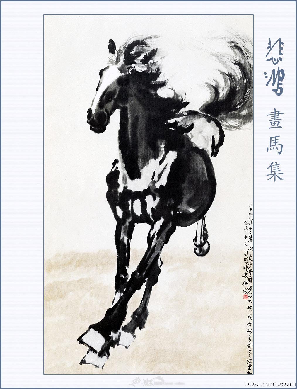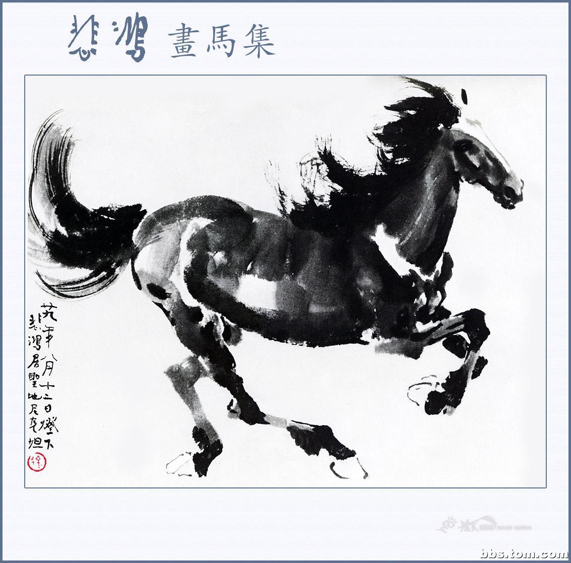 徐悲鸿(1895—1953),是现代中国杰出的画家及艺术教育家。他出身画家家庭,曾被康有为誉为画坛奇才,除了中国水墨画之外,它的油画,素描,书法皆十分出色。然而,最能反映徐悲鸿个性,表达他思想感情的莫过于他写马的画卷。他对马的肌肉、骨骼以及神情动态,作过长期的观察研究,所以他画的马图笔墨酣畅,奔放处不狂狷,精微处不琐屑,筋强骨壮,气势磅礴,腾空飞驰,昂首嘶鸣,回首顾盼,神态各异,足以看出徐悲鸿深厚的艺术功力和卓越的绘画技巧。徐悲鸿的马和齐白石的虾一样,尤其受到人们的赞赏与钟爱,以致成为中国绘画的一种典型代表与象征。几乎历代中国画坛皆有画马高手,但他画的马却更具精神和动感,体现着一种雄健壮美的神韵,散发着英雄主义的精神,真可谓“前无古人,后无来者”。被誉为“天下画马第一人”,一代宗师的神韵在他的画马作品中体现的淋漓尽致。如果说莫奈为刻划窗前手植的睡莲奉献了一生最后的十年,那么,徐悲鸿为使马臻于神妙所倾注的则是四十年的心血。