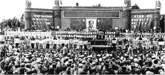 从1966年8月至11月,毛**先后八次接见红卫兵,接受检阅者达上千万之多。红卫兵也由最初的非法地下组织转为公开,并迅速风靡全国。这是红卫兵在天安门广场接受检阅时的壮观场面。
