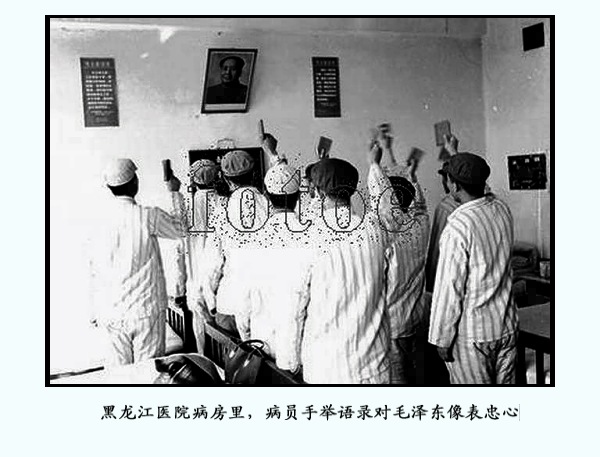 黑龙江医院病房里,病员手举毛主席语录对着毛主席像表忠心.