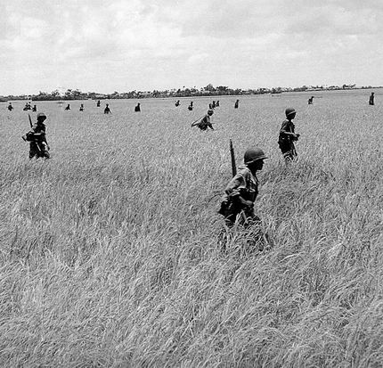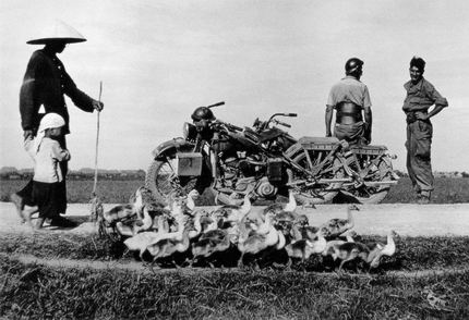 越南农民赶着一群鸭子蹒跚走过路边的法军摩托车。如果没有战火,脱下军装的法国人可能是很好的游客,但现在的画面不过 是为刀枪相见的战争做了一个注脚。