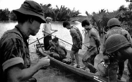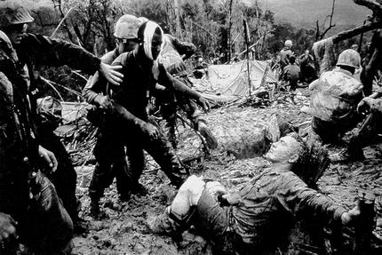 头缠绷带的黑人士兵几乎不知道他应该往哪里走,于是那个戴眼镜的医生指引着他绕开躺在泥地上的伤者。这张照片恰如其分 地反映了当时越战士兵的迷茫—选择生存还是死亡。