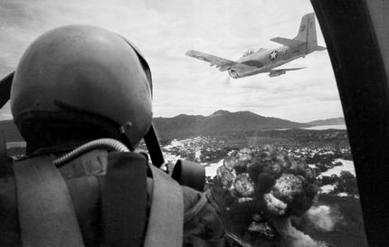 在1962年的一次战役中,美空军飞行员向北越地下目标投掷凝固汽油弹,他的一侧是美军的T-28空中骑士战斗轰炸机。飞机下面是爆炸后的火云。