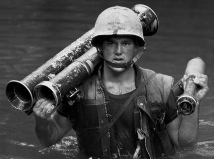 约翰·韦尔森中士肩抗一具火箭发射筒和弹药艰难的泅渡过一条充满怪味的河,12天后,他在一场遭遇战中阵亡。