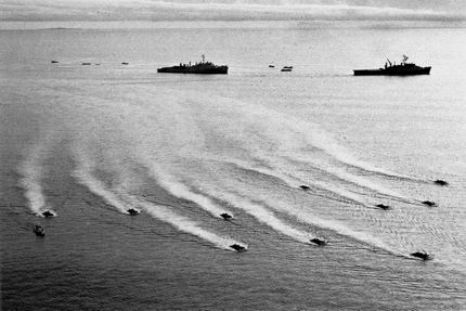 美国海军陆战队士兵乘坐登陆艇在越南近海抢滩登陆。