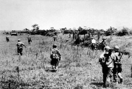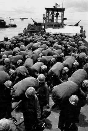 十一装甲骑兵团的士兵肩抗自己的行李包准备上岸。这批新兵在踏上越南国土之前仅仅是在地图上听说过这个遍布热带雨林的东南亚国家。现在作为美国军队的一分子到此参加战争。只有上帝知道他们其中谁可以在两年后扛着同样的大包离去。美海军在越南近海抢滩登陆