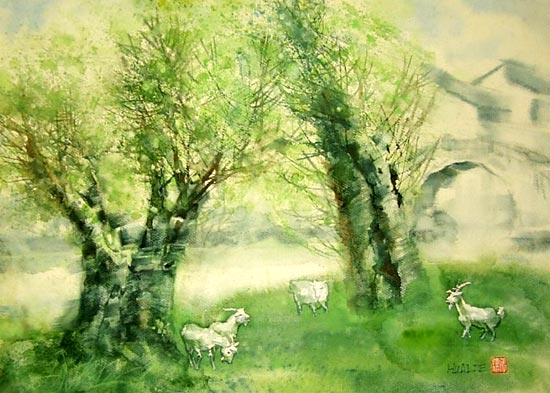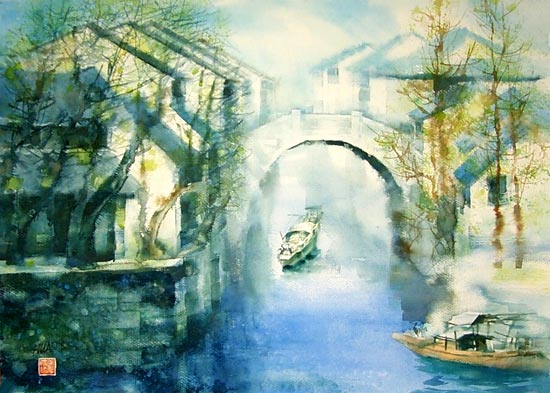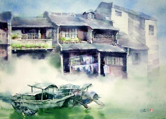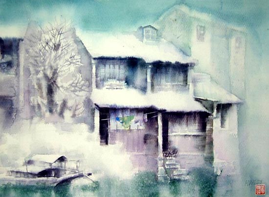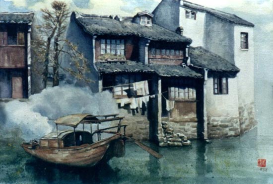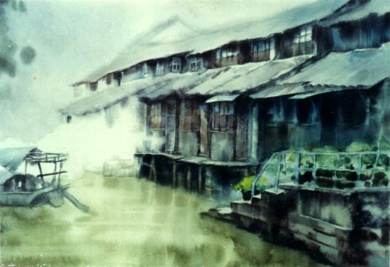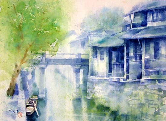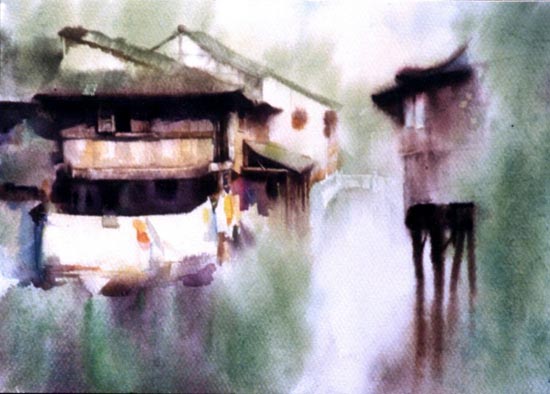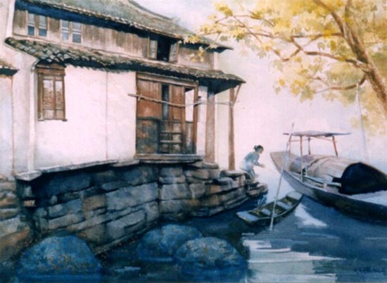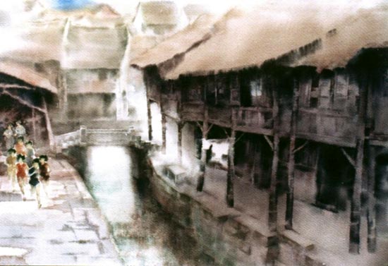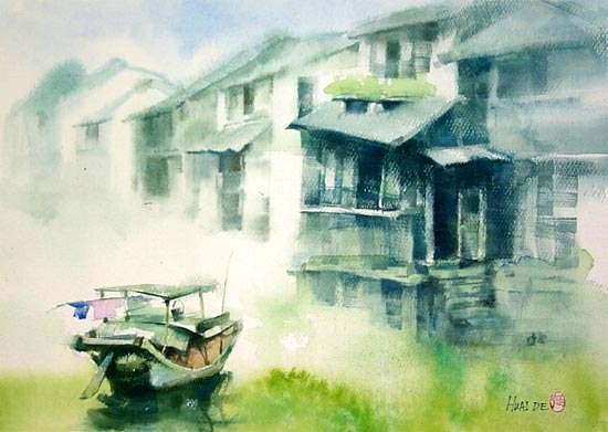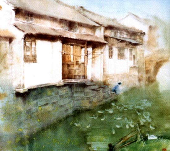 作品的优劣在于其符号载体的运用与艺术家情感表现的统一程度。张怀德的作品以其质朴自然的基调、清新淡雅的风格向人们展示了江南古镇的恬静与幽雅。作品在色彩处理上力求表达出丰富的光感与层次,充分表现烟雨迷濛、滋厚润泽的艺术效果。无论是河畔的老屋还是雨中的荷花,都充盈着迷人的韵致和意境。画家力求在传神达意中追求艺术境界与品味的升华。他对江南的迷恋和激情在作品中自然而然地流露。张怀德清丽多姿、淡雅率真的作品将赢得众多知音,使人们的心灵产生共鸣。