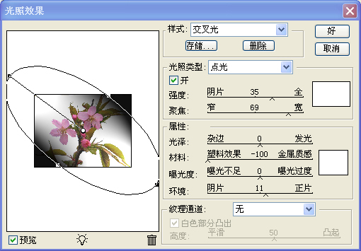 滤镜--渲染--光照效果,用鼠标移动椭圆形的弓弦,光照效果可以变幻无穷.