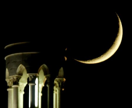 2003年11月26日,悬挂在约旦首都安曼一座清真寺尖塔上方的夜空的一轮弦月。