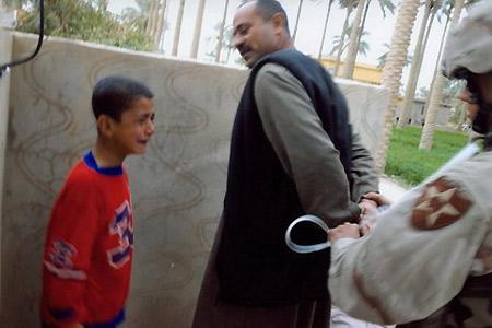 美国记者Yuri Kozyrev所拍摄的《押着伊拉克人的美军》赢得了非突发性重大新闻类单幅金奖,图为美军押着AliMuhammadSaid(右起第二人)和其他三个伊拉克人。