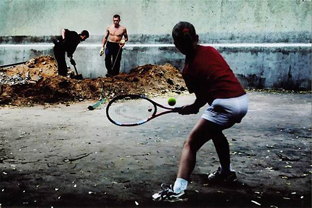 这是获得体育新闻类组照金奖的作品《俄罗斯女子网球》之一。9岁的LenaKuznetsova在莫斯科一训练场训练,旁边的工人正在挖新的下水管道。