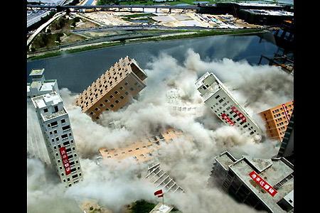 中国记者林勤所拍摄的《中国农村城市化改革第一爆》赢得了经济及科技新闻类单幅金奖,图为与香港一河之阁的皇岗口岸落马洲大桥下的渔农村,15栋高层握手楼,经两工程院院士现场采用定向爆破,在12秒内全部炸掉。