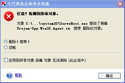 卡巴报警我的电脑中了Trojan-Apy.Win32.Agent.iw.,附报警图!
