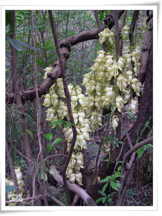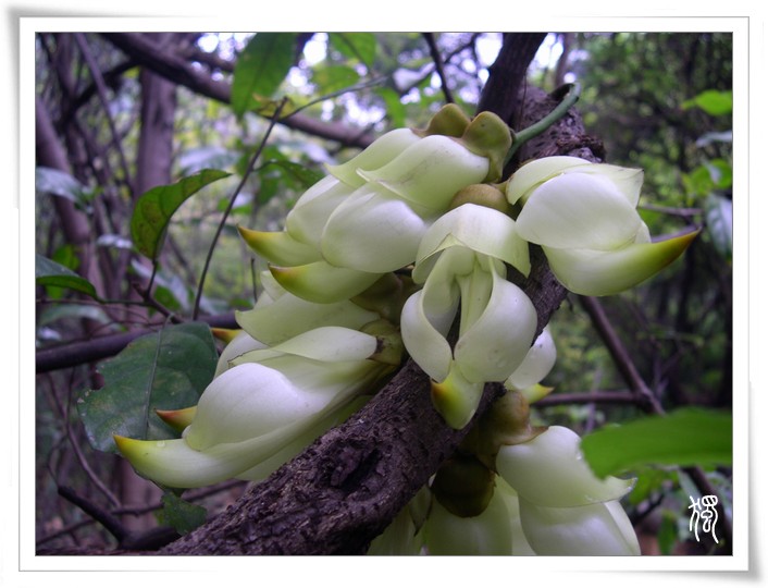 禾雀花,为蝶形花科木质藤本,又名花汕麻藤、雀儿花,属于珍稀植物,因酷似禾雀而得名。 禾雀花”长约5至8厘米,共有五块花瓣,每朵花都好像一只小鸟,花瓣颜色多样,有淡绿色、紫色、褐色、乳白色等。禾雀花每年清明前后开花,簇串状花穗,直接长在藤蔓上。其花形酷似雀鸟,吊挂成串有如禾雀飞舞。花瓣呈淡绿色,有两块花瓣会卷拢成翅状,花托似禾雀头,两旁各有一粒似眼 睛的小黑点,正中的一瓣,弯弓似雀背,两 侧的花瓣似雀翼,底瓣后伸,似为尾巴。