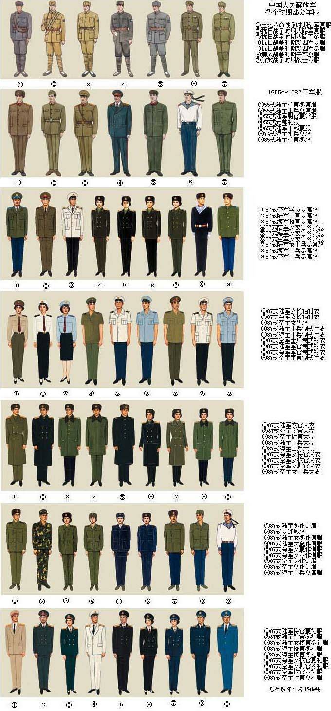 中国人民解放军军服发展概况 1927年8月1日,南昌起义部队穿的是国民革命军的服装,系红领巾以示区别。早期的工农红军军服,为灰色中山装(部分部队是青色或蓝色),打绑腿,穿布鞋或草鞋,戴八角帽,佩带红领章、红五角星帽徽。禁止讨论政治话题战争时期,八路军军服为土黄色中山装,新四军为灰色中山装,军帽为直筒加帽围的圆顶帽,左臂佩带“八路”或“N4A”字样的臂章。解放战争后期军服颜色有土黄色和灰色两种,胸前佩带有“中国人民解放军”七个黑字的白底红边胸章,帽子改为解放帽,佩带“八一”铜质红五角星帽徽。1950年,全军服装式样统一为开襟式(战士夏服为套头式),大檐帽。服装颜色陆军为绿色,空军为上绿下蓝色,海军单衣为上白下蓝色,棉衣为全蓝色。1955年,随着军衔制实行,军服分为礼服和常服。礼服,元帅和陆军、空军为海蓝色,海军为藏青色,西服式,领边、袖口、裤缝饰不同颜色的军种牙线。陆军常服为棕绿色,海军常服为上白下蓝和全蓝两种颜色,空军常服为上棕绿下蓝色,均为立翻领,军官上衣为四个口袋,陆军、空军士兵为两个暗胸袋,海军士兵为套头式水兵服;军官为大檐帽,士兵为船形帽,女军人为无檐软帽,冬季均为栽绒帽或皮帽;校以上军官为毛料,尉官为斜纹布,士兵为平布。1965年,官兵一律改为佩带红五角星帽徽、红领章,戴解放帽,海军军服式样与陆军、空军相同,颜色为灰色。1988年,实行新的军衔制度,换发87式军服。1994年军服着装实行区分种类统一编号,夏常服着装分三种,冬常服着装分四种,作训服着装分四种。参加操课、执勤或集会、校阅等统一着制式军鞋。着装具体要求,按条令和有关规定执行。1997年5月1日开始在驻香港部队中试穿新一代军服。