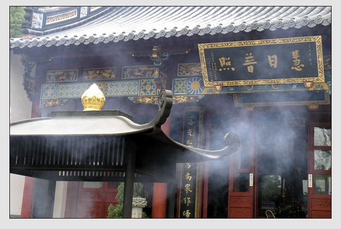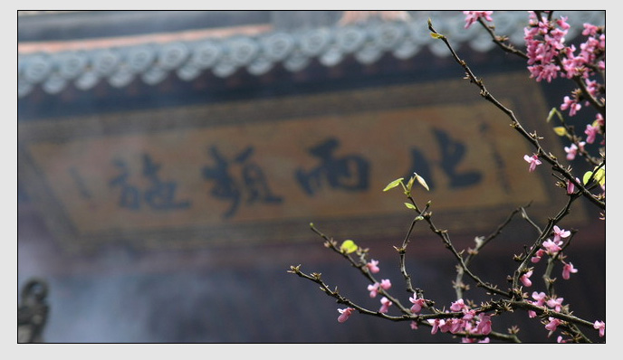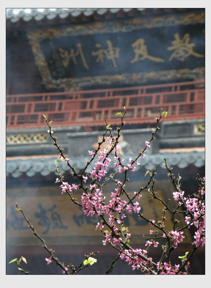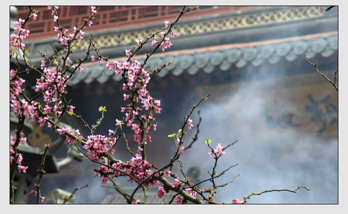 有花的几张,隐约的牌匾与烟雾映衬得粉花份外娇丽.....偶的心不静反乱了,为了这春天~~