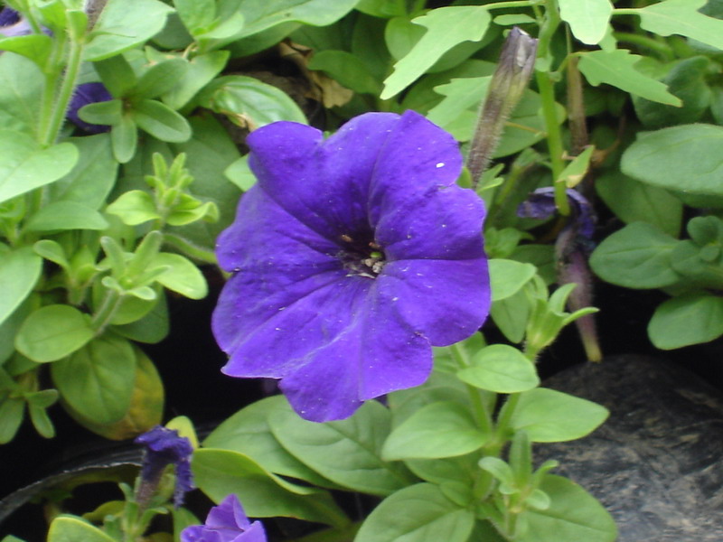 [科属及形态]茄科,矮牵牛属。一年生或多年生草本,株高50~6O厘米,茎直立或蔓延地面长达数尺。叶卵形对生,全株有软毛,花形似牵牛花,漏斗形,先端具钝波状线裂。花瓣变化多,有单瓣、半重瓣、重瓣之分,花色有红、白、紫、深紫及各种斑纹。