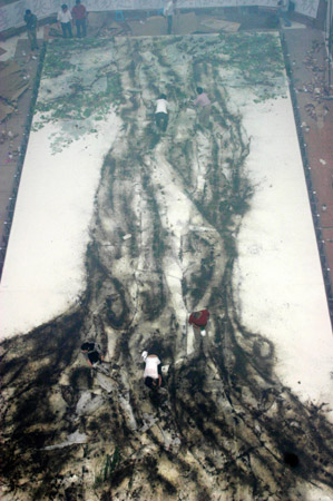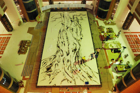 巨榕成型,工作人员正在做最后的清理