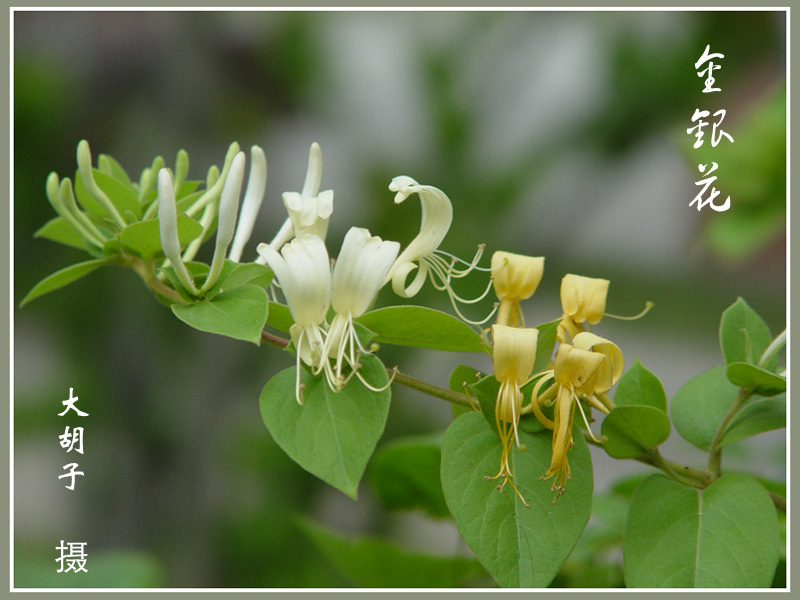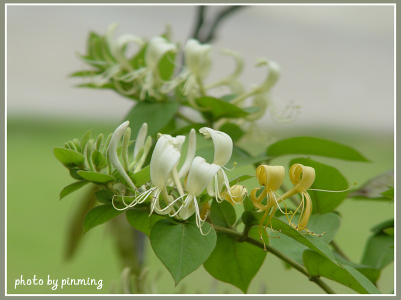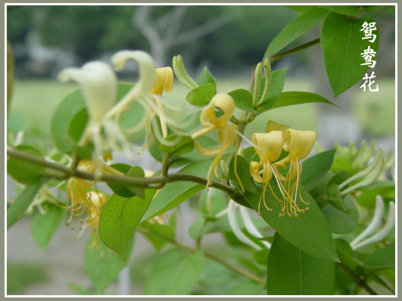 此花总是成双成对生于叶腋,故有“鸳鸯花”之称。因其秋末老叶枯落时,叶腋间已萌新绿,凌冬不凋,又名“忍冬”。