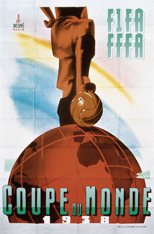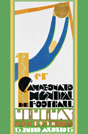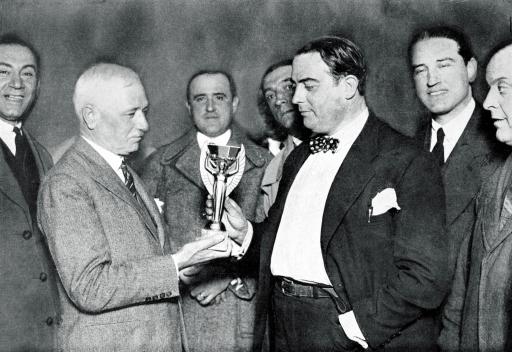 1930年7月30日 国际足联主席雷米特(左)向乌拉圭足协主席朱德颁发冠军奖杯