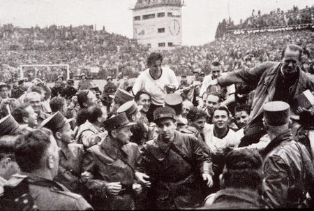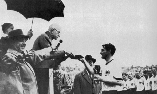1954年世界杯西德队长瓦尔特从国际足联主席雷米特手中领取世界杯奖杯