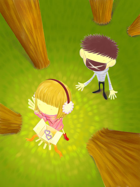 在森林裡面,她找到了他,他身邊放了個小禮物,應該是為了她準備的情人節禮物,