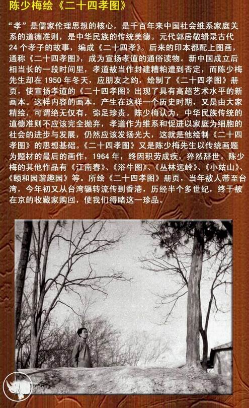 陈少梅认为,中华民族传统的道德准则不应该完全抛弃,孝道作为维系和促进以家庭为细胞的社会的进步与发展,仍然应该发扬光大,这就是他绘制《二十四孝图》的思想基础。《二十四孝图》又是陈少梅先生以传统画题为题材的最后的画作,1964年,终因积劳成疾,猝然辞世。