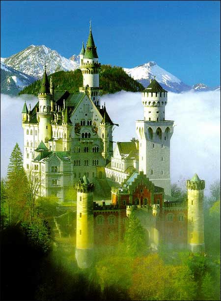 为了实现他梦幻中的世界,巴伐利亚国王路德维希二世建造了一座宫殿,就是这座新天鹅堡。由新天鹅堡远眺,眼前是由法尔格湖,阿尔高阿尔卑斯山和菲森组成的广阔风景。