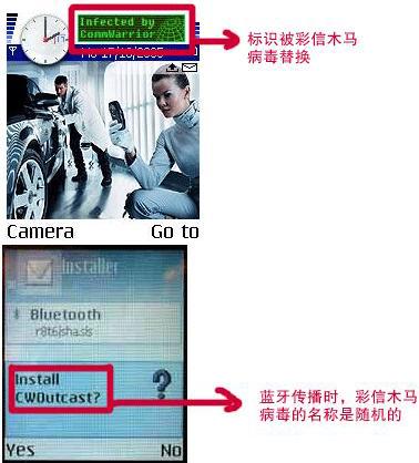 2.Commwarrior 寻找通过蓝牙可达的手机,使用蓝牙传播向找到的所有手机发送被感染的 SIS 文件。接收方如果不同意接收蓝牙传来的文件,就会不停的收到是否同意接收的提示,以至于不耐烦的点了接收,病毒就传到手机里了。Comwarrior 发送的 SIS 文件被随机命名,因此无法警告用户避免任何已知文件名字的文件。