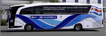 哥斯达黎加队大巴,口号是 Our army is the team,our weapon is the ball,let's get to germany and give it our all(球队是我们的军队,足球是我们的武器。进军德国,全力以赴)