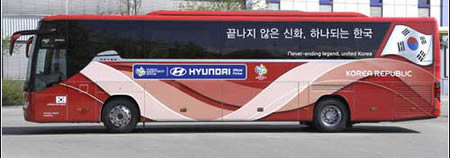 韩国队大巴,口号是never-ending legend,united korea(神话尚未结束,韩国团结一心)