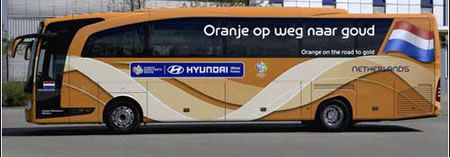 荷兰队大巴,口号是Orange on the road to gold(橙色军团在金杯之路上)