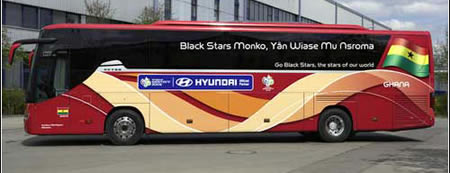 加纳共和国队大巴,口号是go black stars,the stars of our world(前进吧,黑色之星,世界之星)