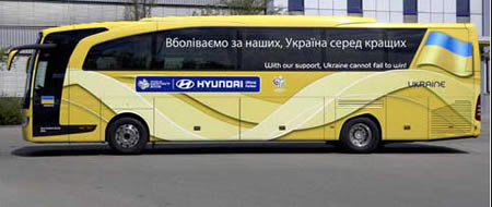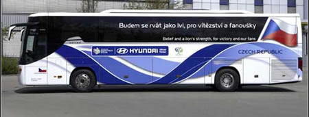 捷克共和国队大巴,口号是belief and a lion's strength,for victory and our fans(必胜的信心加狮子的力量,为胜利,也为我们的球迷)