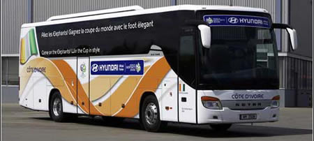 科特迪瓦队大巴,口号是come on the elephants!win the cup in style(加油,巨象们!潇洒地捧起金杯)