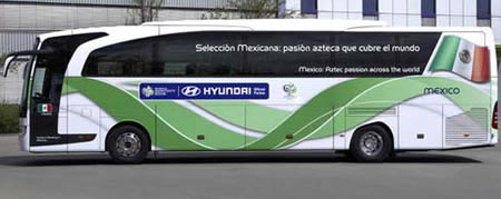 墨西哥队大巴,口号是aztec passion across the world(阿兹特克激情横扫世界)