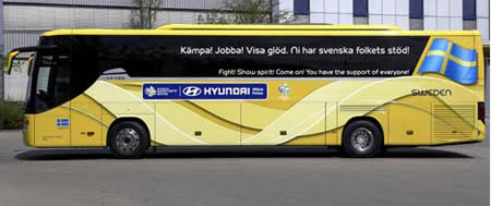 瑞典队大巴,口号是 fight!show spirit!come on!you have the support of everyone!(冲吧!展示你的勇气!加油!所有人都支持你!)