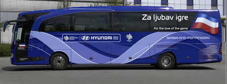 塞黑队大巴,口号是for the love of the game(为热爱足球而战)