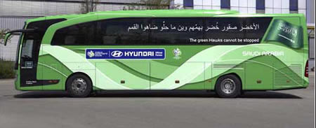 沙特阿拉伯队大巴,口号是the green hawks cannot be stopped(绿鹰所向披靡)