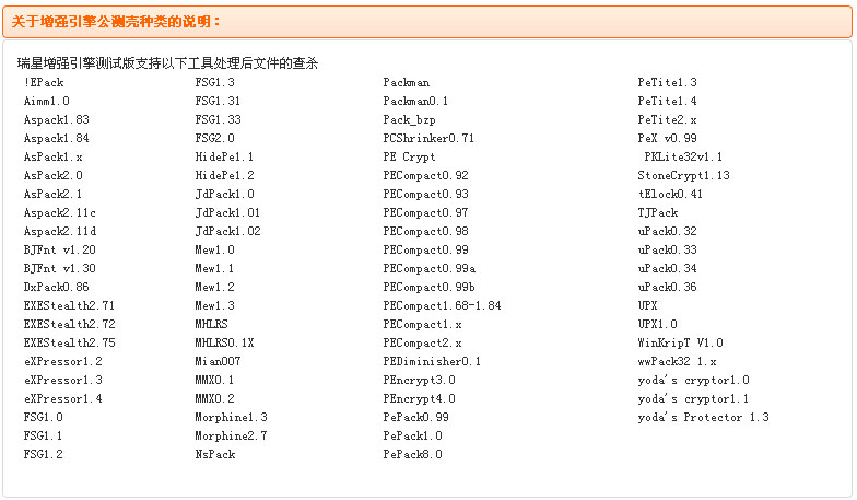 去网站看了下,也就那么一点不同的地,它把那些能杀的壳都列了出来(如图),以前的杀软把这些东西都当宝贝似的藏着掖着,瑞星这回这么做,我想是因为它对自己已经很有把握了,不怕谁研究。看来是真的有那么点厉害的感觉了。