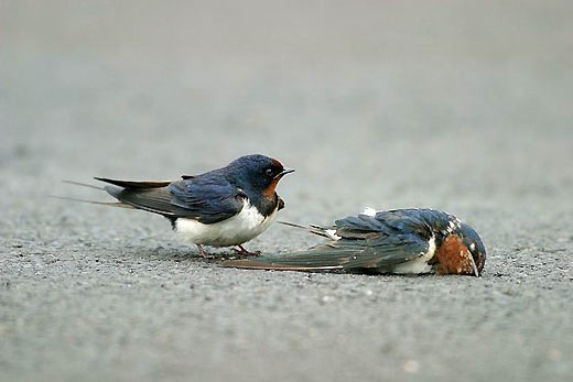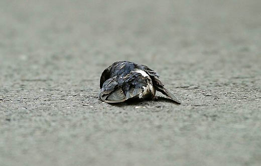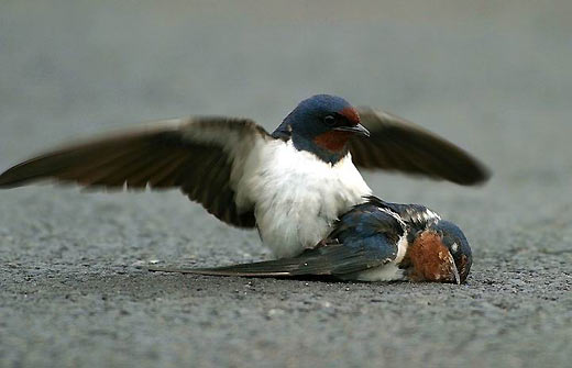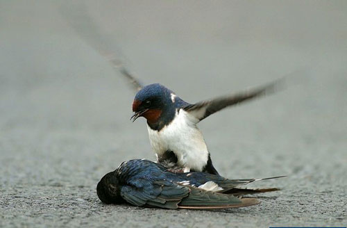 星期六的下午,天气阴霾,很多的家燕,成群停留在马路上觅食戏耍,看着来往的大货车。突然,一辆呼啸而来的大货车经过,地上只看到一团黑影留着,不幸又发生了。尽管这只家燕已经在地上不会动了,但是,另一只马上飞到她的身旁,不忍相信这个事实……